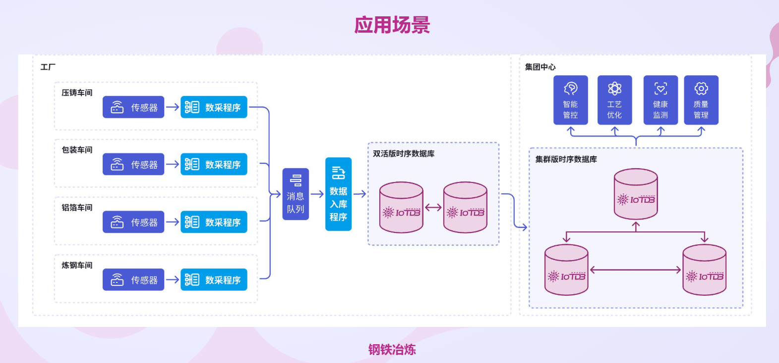 在智能工厂中,数千台设备产生海量传感器数据。IoTDB可以: