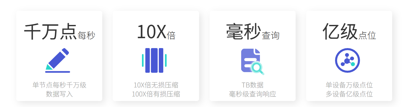 - 千万点/秒写入: 单节点每秒千万级数据写入能力