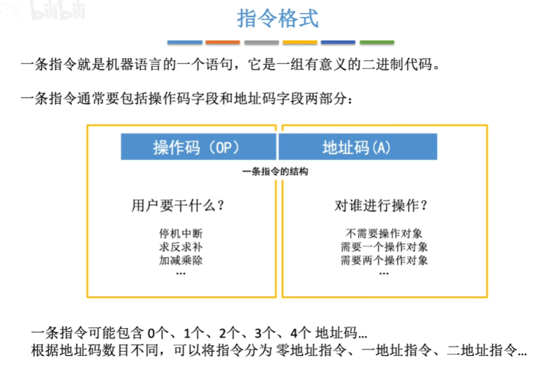 指令由操作码(OP)和地址码(A)组成,操作码决定着用户要干什么,地址码决定着对谁干,所以根据不同的操作码,对应的地址码的数目也可能出现变化。如加减运算指令,就需要两个地址码,而停机指令,就不需要地址码。