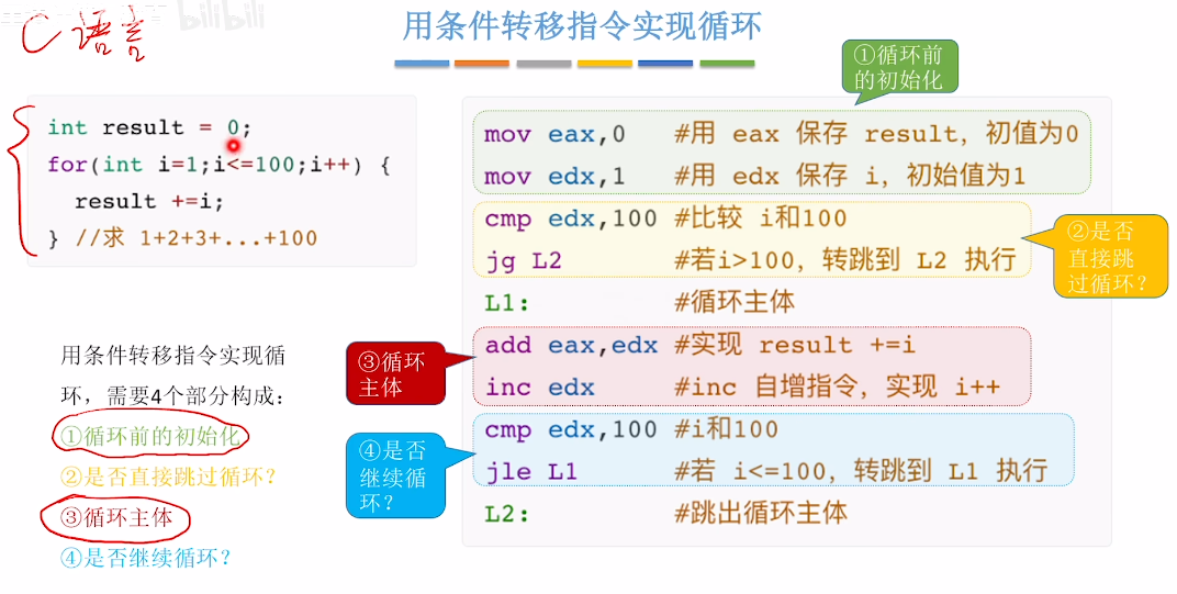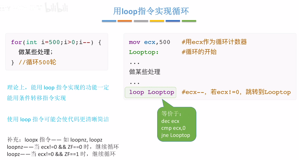 如上图的for循环程序,可以通过loop实现,loop指令就等价于先令ecx寄存器里的数据执行自减操作,再与0比较,若不等于0,则跳转到程序的开始处。