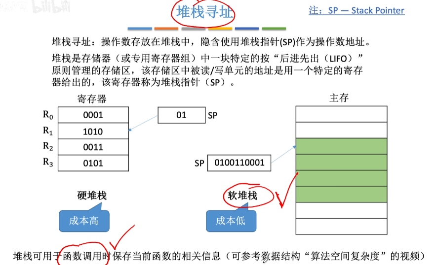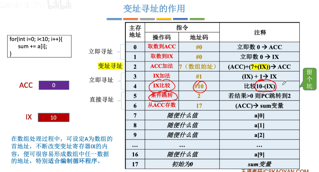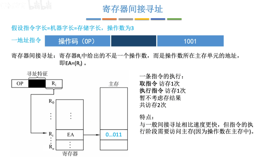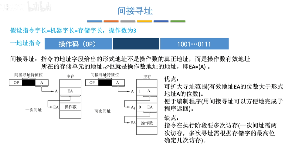 这里说一下两次间址,就是根据形式地址去主存里找到的该地址上的数据,并不是操作数,而是操作数在主存里的地址,需要通过这个地址,再去主存里找操作数。一般情况下,两次及多次间址会在主存里的每一条数据前留一个比特位用来判断根据当前存储单元存储的数据找到的是操作数还是操作数的地址,如果为1说明根据这个存储单元里的数据找到的是存储在主存里的操作数的地址,如果为0说明根据这个存储单元里的数据找到的是存储在主存里的操作数,具体可以参考上图的两次间址。