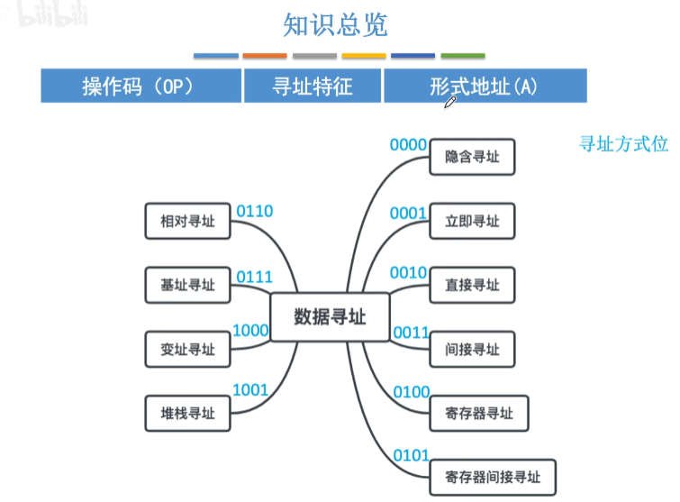 上面是数据寻址常用的10种方法,为了区分使用的是何种方式,我们要在原指令结构里添加几个比特位做寻址特征字段,用来表示使用的是何种方法。