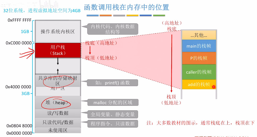 在32位系统中,系统会为每个进程分配一个4GB的虚拟地址空间,地址范围从0000 0000~FFFF FFFF,总共4GB。高地址的1GB属于操作系统内核区。而低地址的3GB可以由用户进行使用,而函数调用栈的栈底在C000 0000处,栈顶在地址变小的方向,因此大多数教材在画函数调用栈时会把栈底画在上面,栈顶画在下面,因为上面是高地址方向,下面是低地址方向。