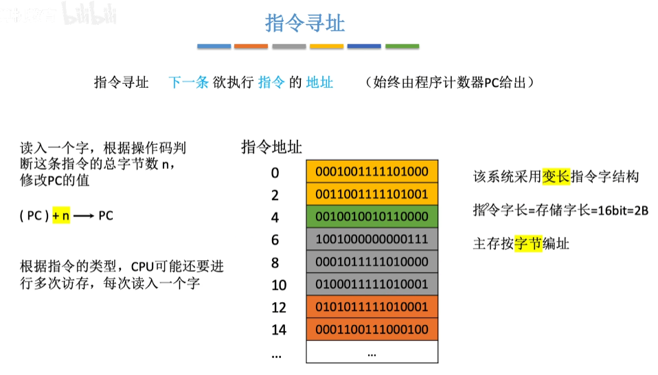 上面的指令系统采用变长指令字结构,这里的指令字长就不在是固定的,所以上图右边的指令字长=存储字长=16bit=2B可忽略。主存按字节编址。这个时候读入一个字,CPU要根据其操作码判断这条指令的总字节数n,然后再修改PC的值。