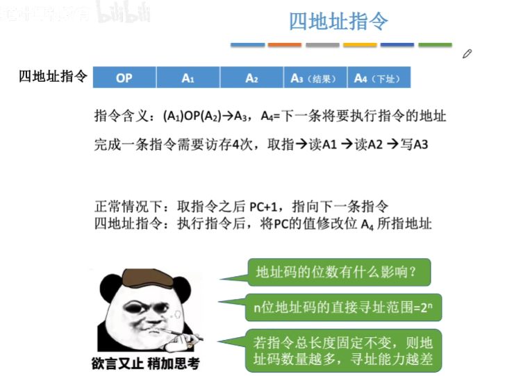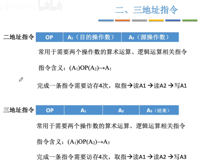 对于三地址指令,完成一条指令需要访存4次,第一次,取出A1和A2地址;第二次读A1地址上数据;第三次读A2地址上数据,第四次将数据写入A3地址内。