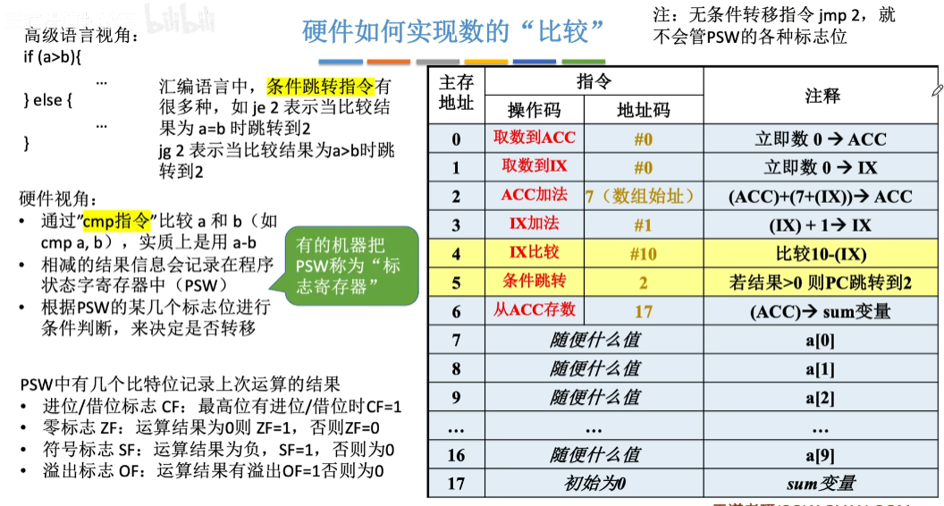上图左上给出了intel的8086CPU里的16bit程序状态寄存器,其中第0bit存储CF标志位,第6bit存储ZF标志位,第7bit存储SF标志位,第11bit存储OF标志位。条件转移指令jxxx执行时,会去查询这些标志位,进而确定该不该执行跳转操作。