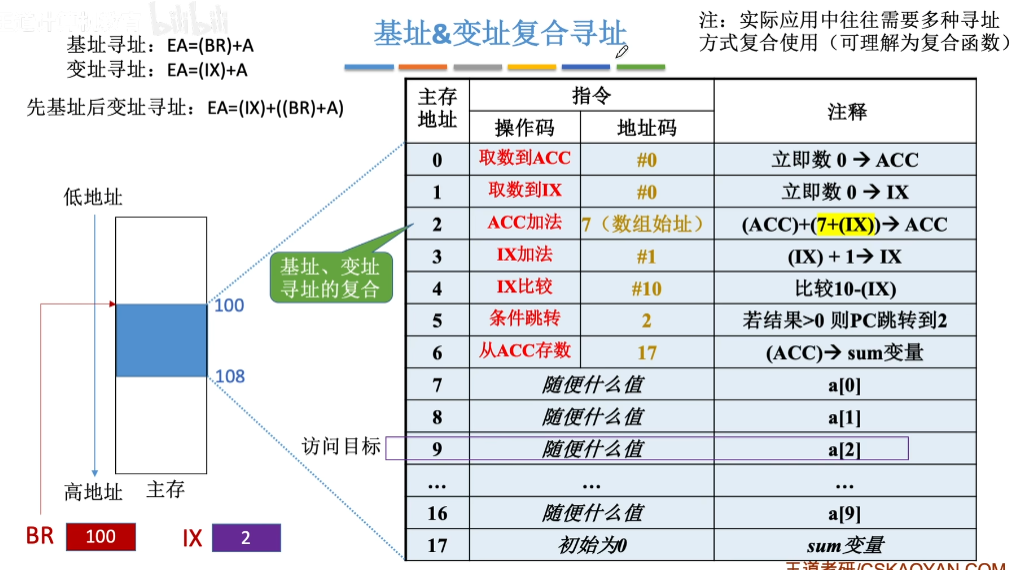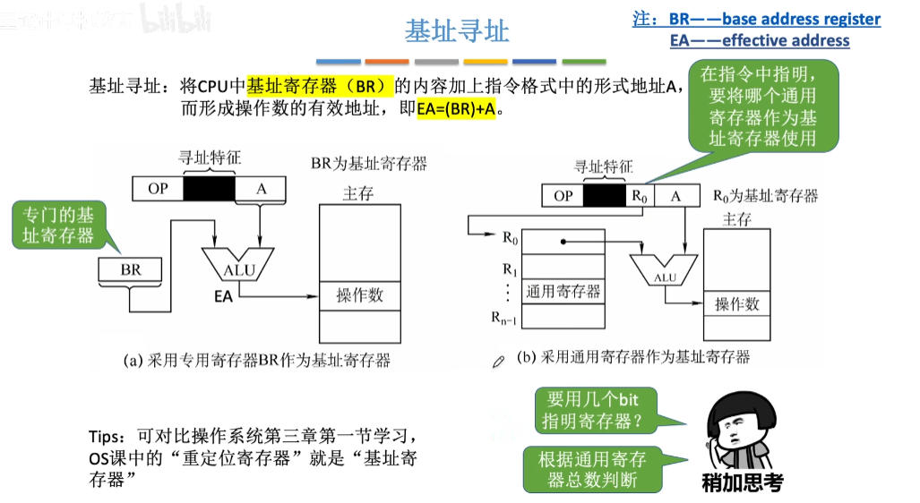 如果使用专用寄存器,则专用寄存器里存储程序的首地址,想找到操作数,就需要通过基地址加上偏移量来查找,即BR里存储的基地址加上A里存储的形式地址得到有效地址。