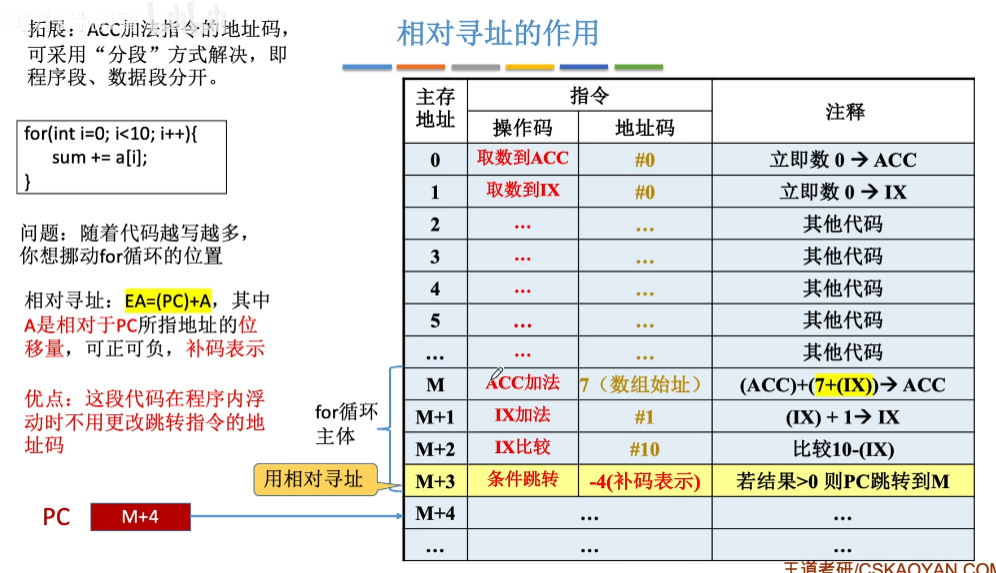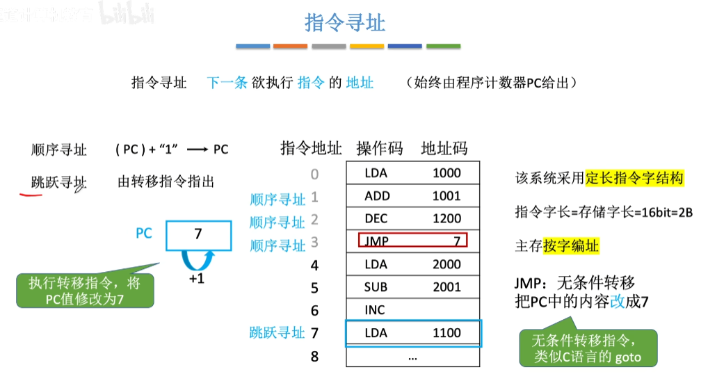 跳跃寻址,顾名思义,就是指由本条指令给出下条指令地址的计算方式,指令之间执行的不是顺序关系,不能通过PC+1的方式来查找下一条执行的指令。跳跃寻找需要通过转移类指令实现。如上图,在主存的第四个存储块里,存储着JMP 7的指令,JMP就是无条件跳转指令,此时PC不应该加1指向4,而应该指向7,这就是跳跃寻址。