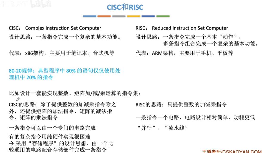 如上图下,站在硬件角度觉得例子,CISC思路会提供所有的复杂指令,但RICS思路只会提供普通的整数加减乘指令,然后由这些简单指令去实现矩阵的加减乘。