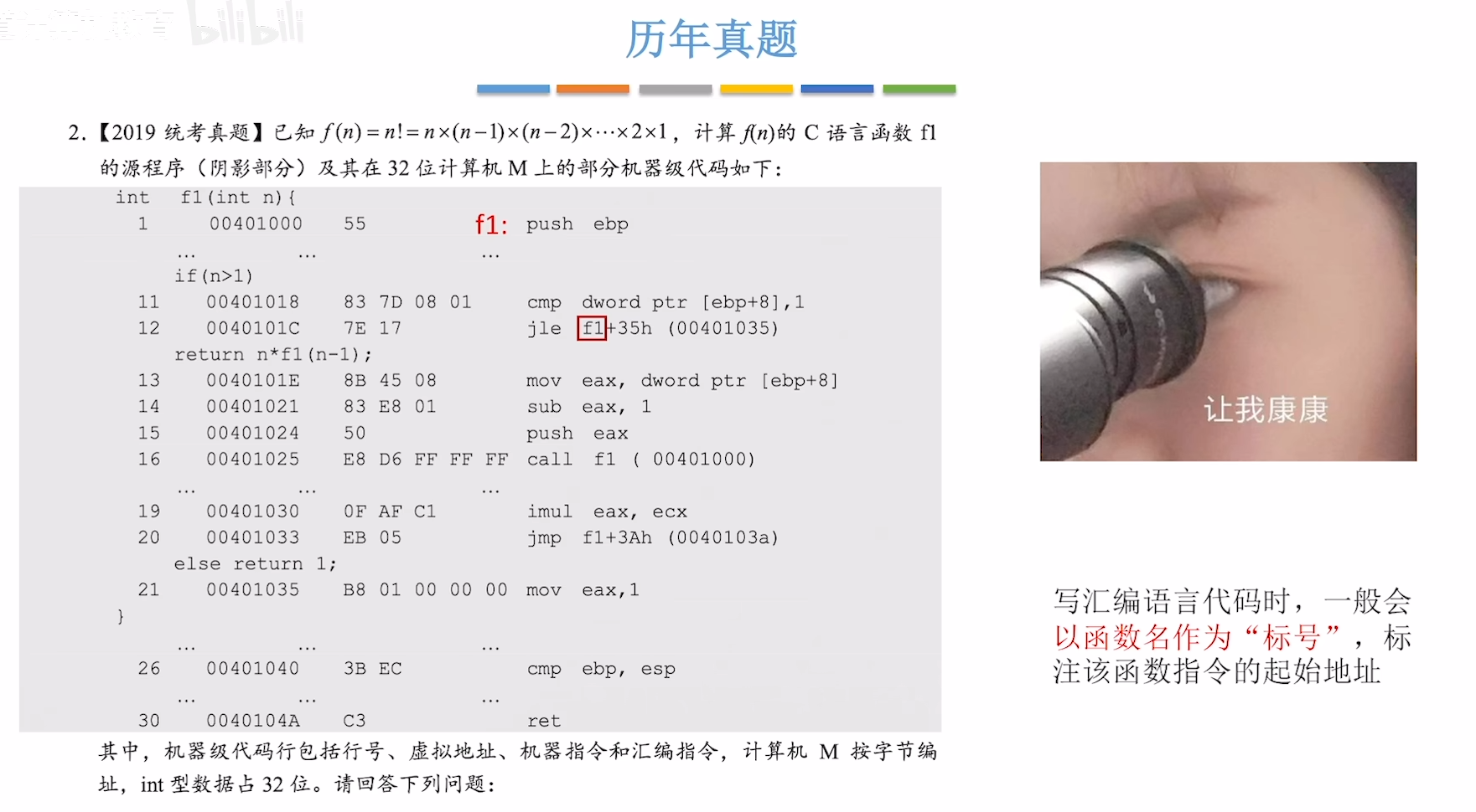 对于这道题,有一点要说一下,汇编程序员在写汇编指令时,一般都会以函数名作为标号,标注该函数指令的起始地址。所以在题目里有这么一段汇编程序jie f1+35h,看似操作数使用的16进制的立即数,实则是指在函数的起始地址上偏移35h,因为这段函数的名字为f1,所以这里的f1代表着该函数的起始地址。