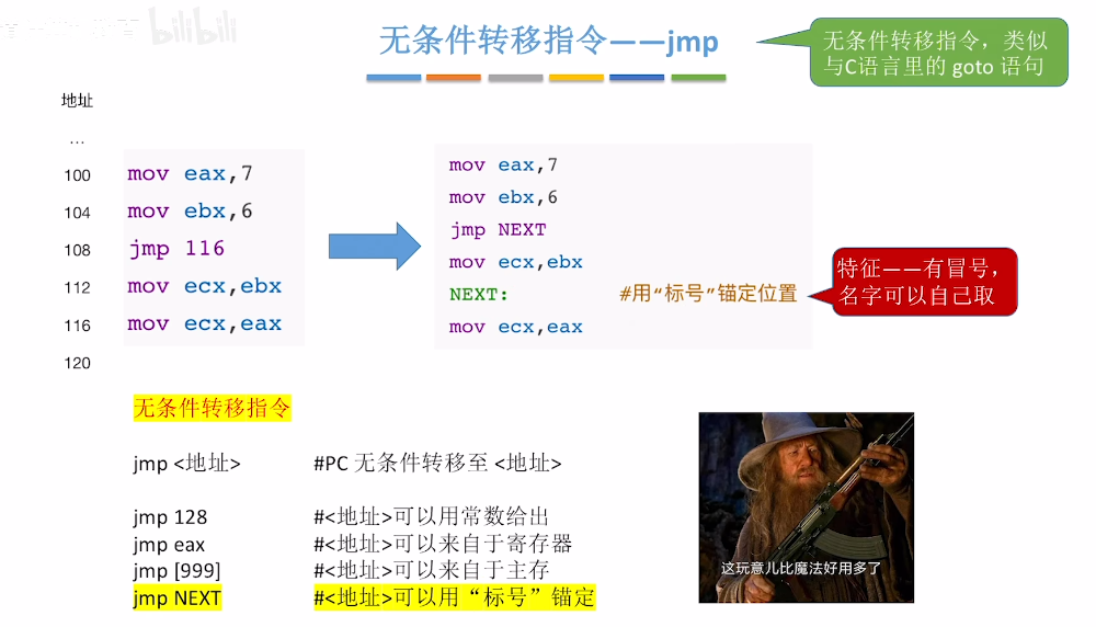 但是,如果只能通过指定地址的方式来确定PC的指向的话,如果更改了这段程序在主存里的位置,那jmp后跟的操作数也要更改,这对程序员来说,无疑是很难受的,所以,就有了下面的标号法。