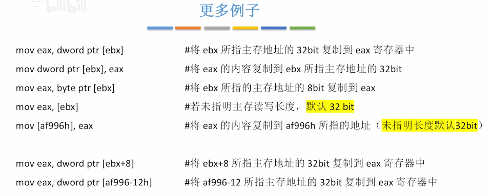 所以mov eax,[ebx+ecx*32+4]这个指令按照上述例子就可以理解为,从数组存放的起始地址ebx处,通过ecx*32+4找到第四个学生的年龄信息,然后把找到的数据放到eax寄存器里。