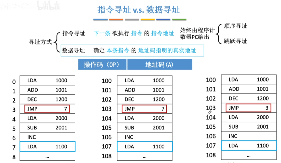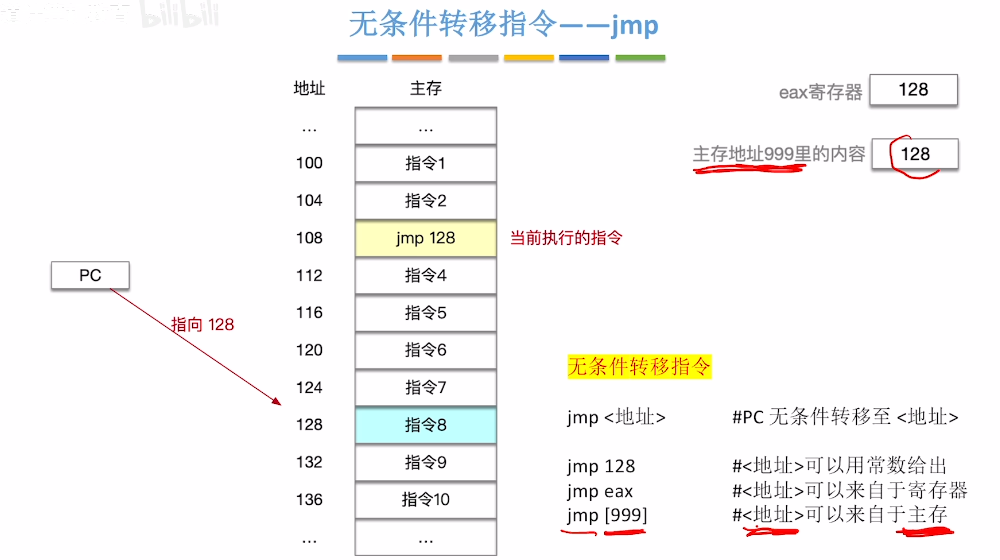 据上图,当PC执行到108时,先从主存里取出jmp 128指令,此时PC+1指向下一条指令起始地址112,但是执行jmp 128时,会发现是jmp指令,此时PC要无条件指向128处准备执行指令8。当然,这个是把操作数放在指令里的,也可以把操作数放在主存和寄存器里,可以参考上图右下角。