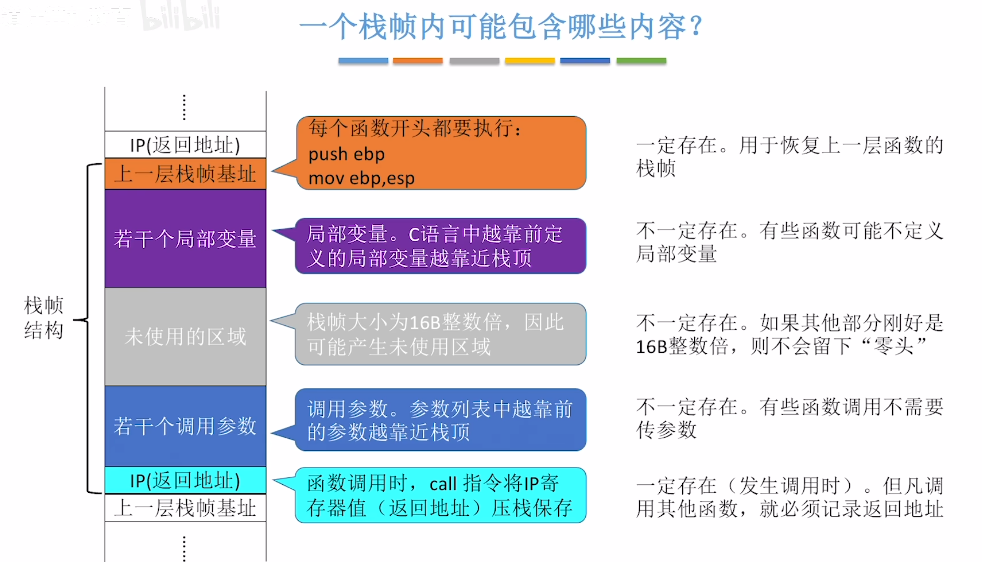 从上图可以知道,栈帧一定有上一层栈帧基址和IP返回地址。其余的区域如局部变量和调用参数等,都不一定存在,具体原因上图也已给出。