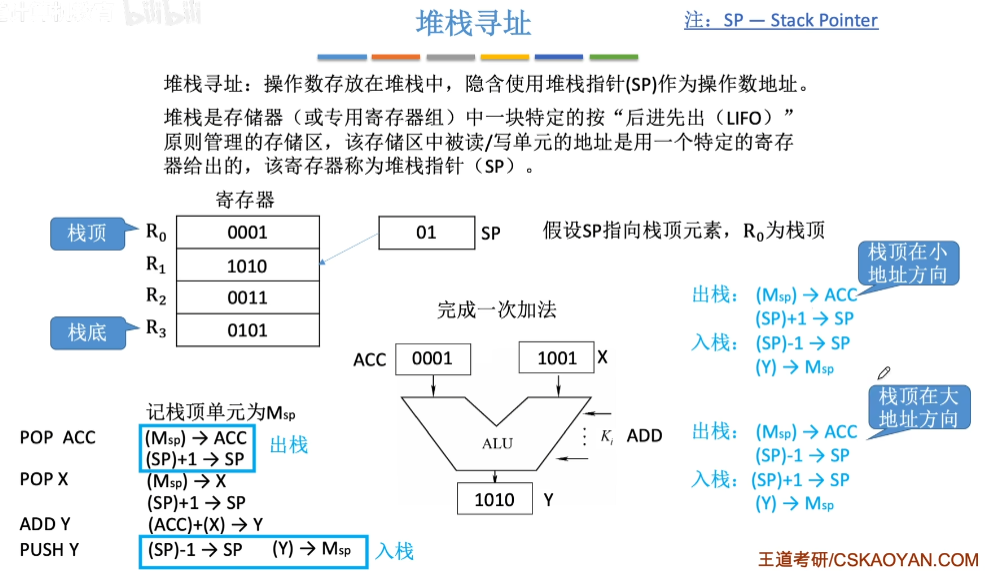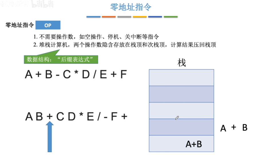 这里有一类比较特殊,就是堆栈计算机,两个操作数隐含在栈顶和次栈顶,计算结果压回栈顶。这里以数据结构里学的后缀表达式为例,如图,先把A压入栈,再把B压入栈,当扫描到运算符时,就代表着扫描到零地址指令,将栈顶与次栈顶元素出栈做运算,运算完再压回栈。在这段过程中,扫描到一个运算符就相当于扫描到了一个零地址指令,而操作数隐含在栈里,并非显示指明。