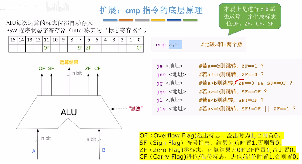 cmp指令的执行,本质是两个数进行减法运算并生成标志位的过程,两个数的运算通过ALU进行(减法运算的详细过程可以参考第二章),计算得到的标志位会被放到程序状态寄存器PSW中。其余的指令执行相关操作时,会去程序状态寄存器里查询标志位,进而推出自己该执行何种操作。