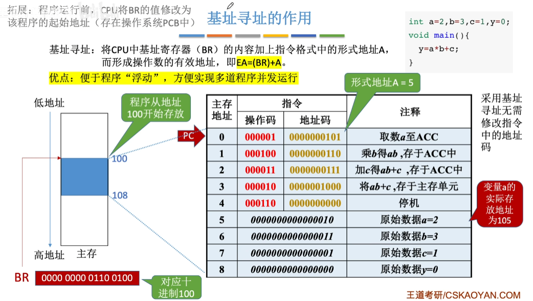 基址寻址,用大白话来说,就是以程序在主存里存储的起始地址为基准,根据这个基准去找有效地址。