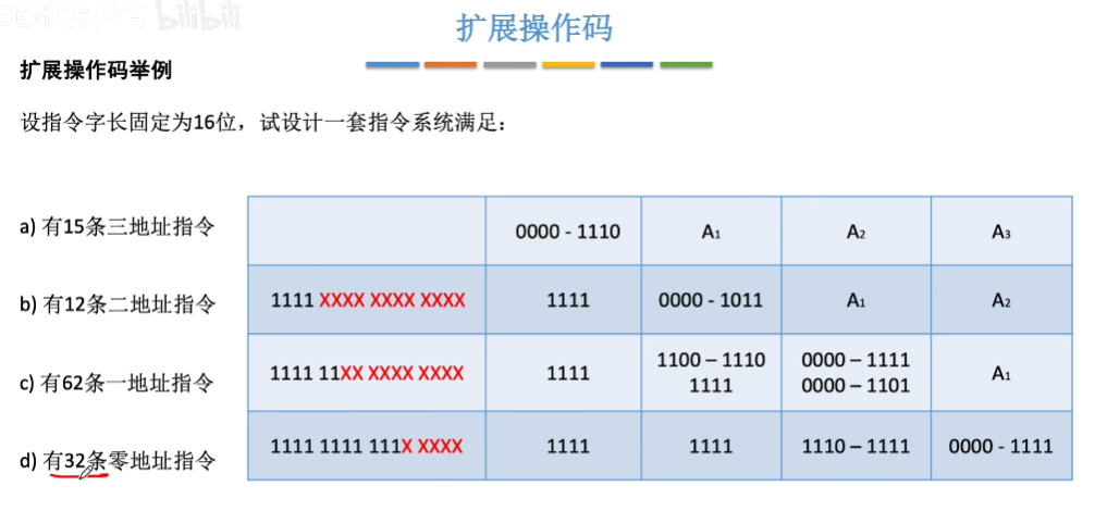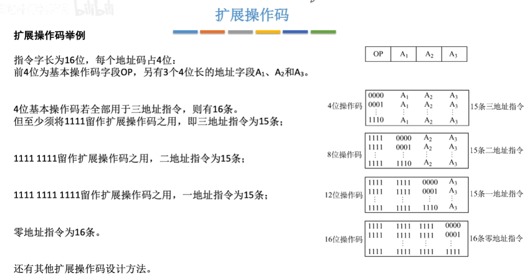 扩展操作码的步骤如上,假设指令字长为16位,每个地址码占4位。如果设计三地址指令就意味着地址码要占12位,操作码要占4位。这样三地址指令最多可以设置24=16条,但要还想设计二地址指令就至少要留出一条1111充当扩展操作码用,也就是说最多只能有15条三地址指令。