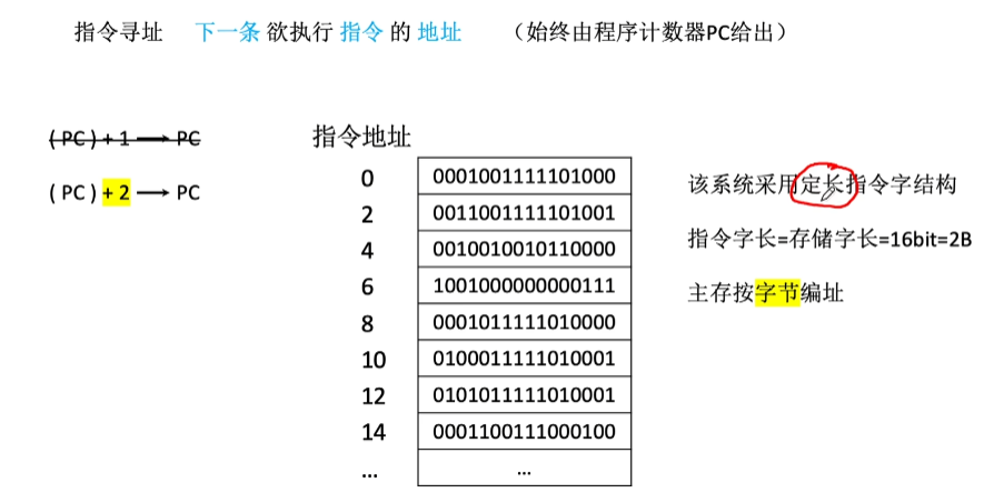 上面是指令字长=存储字长=2B,主存按字节编址的情况。这个时候一条指令仍占一行,即长度为1个字,但是因为按字节编址,所以每一行其实是两个字节,对应下来每一行的起始地址需要加2,所以PC+2。