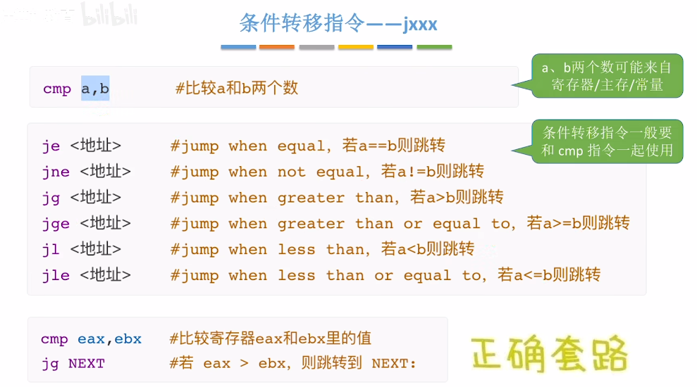条件转移指令jxxx(这里的jxxx是代指,代指je、jne等以j开头的条件转移指令),常与cmp指令一起使用。