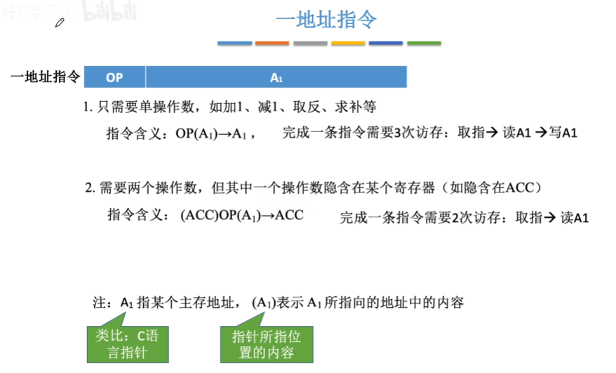 第一种,只需要单操作数,指令OP(A1) -> A1的含义是从 A1地址上取出数据,经过OP操作(即操作运算)后,再把数据存入 A1地址内。完成这样的一条指令要经历3次访存,第一次从主存里取出地址,第二次从主存里取出该地址上的数据,第三次,将操作以后的数据写入该地址里。