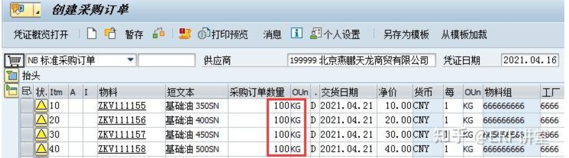 - 首先,ME21N创建一个包含4个物料、4个行项目、数量都是100KG的PO:
