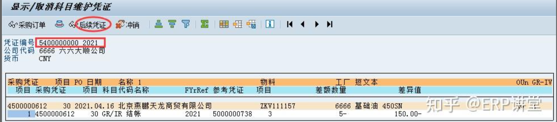 最后,点击"冲销",可对GR/IR清算做冲销处理,点击"后继凭证",可查看会计凭证: