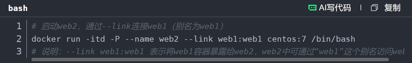 创建"接收容器"web2,通过--link选项连接web1,格式:--link 源容器名称:源容器别名。