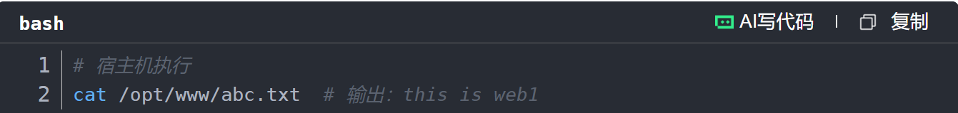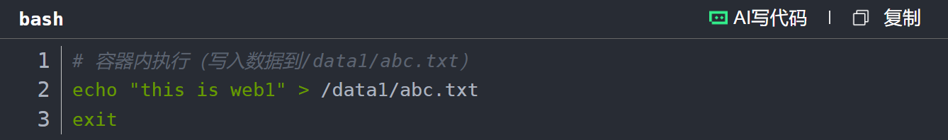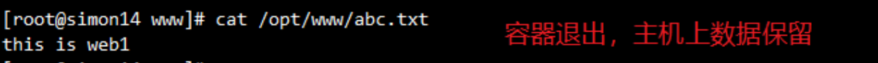 此时,容器中的 /data1/abc.txt 文件与宿主机中的 /var/www/abc.txt 文件是同步的。即使容器退出,宿主机上的数据依然存在。
