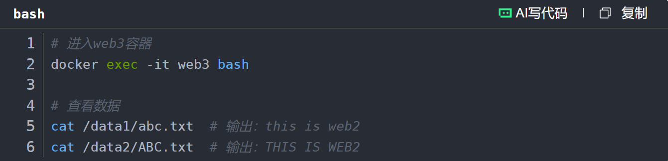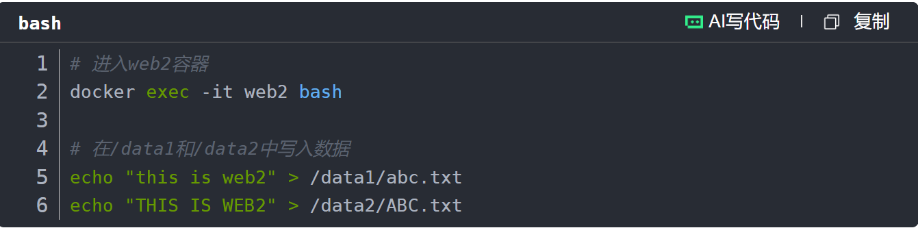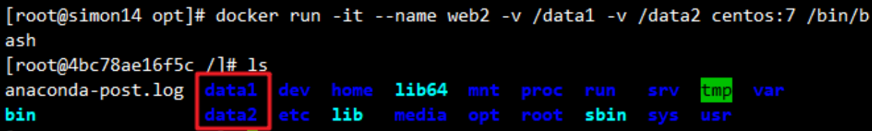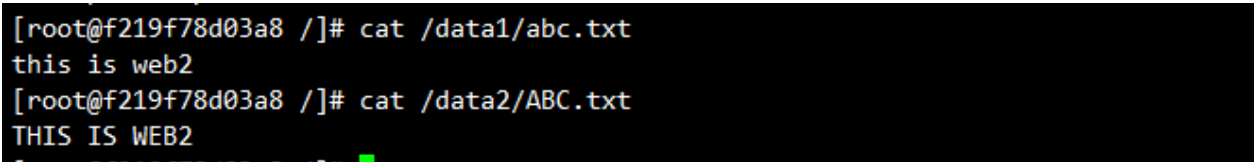 进入web3容器,查看/data1和/data2目录,可看到web2中写入的数据: