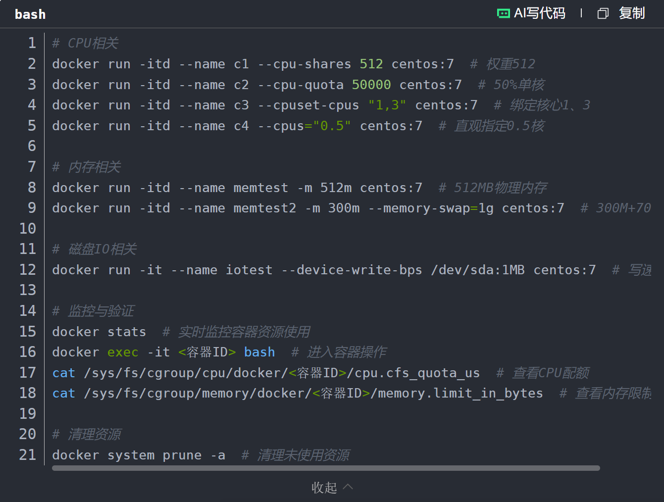 --cpuset-cpus适合对性能稳定性要求高的场景(避免与其他进程抢核)(如数据库容器)。