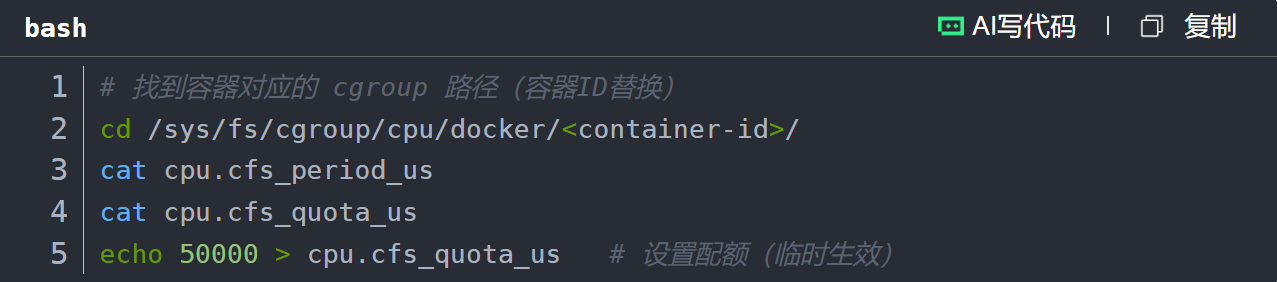 计算公式:可用CPU核心数 = cpu-quota / cpu-period(如50000/100000=0.5,即50%的单核CPU)。