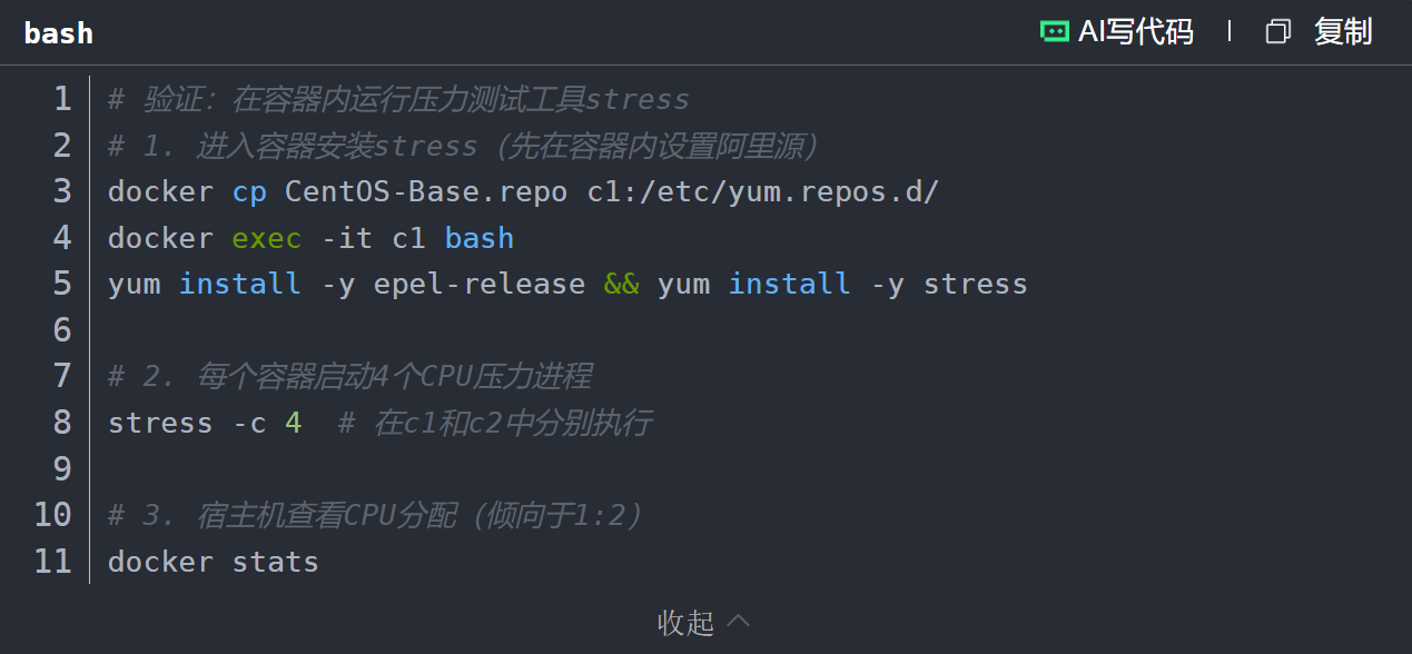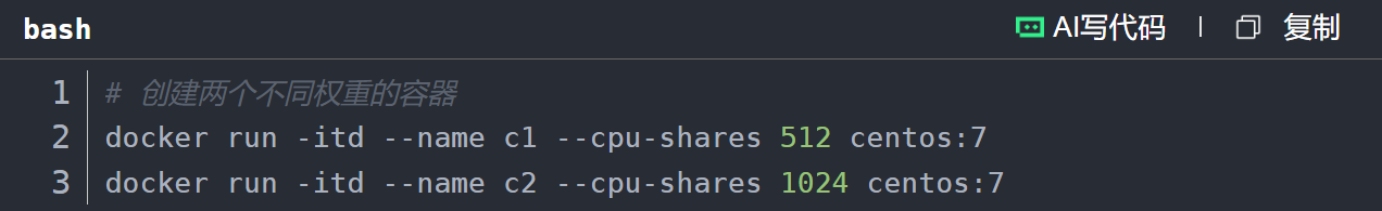 原理:--cpu-shares指定CPU使用的相对权重(默认1024),仅在CPU资源紧张(容器争用CPU)时生效,并非硬限制。例如: