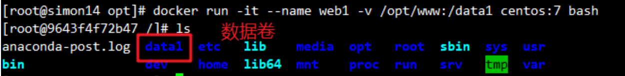进入容器后,在数据卷目录(/data1)中创建文件,数据会同步到宿主机: