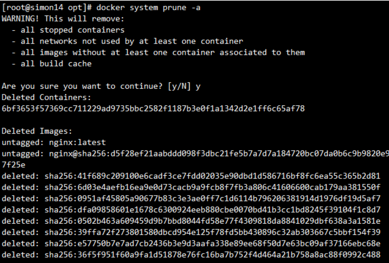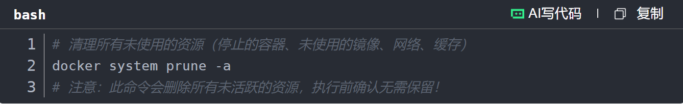 Docker运行一段时间后,会积累停止的容器、未使用的镜像、网络和构建缓存,可通过以下命令清理: