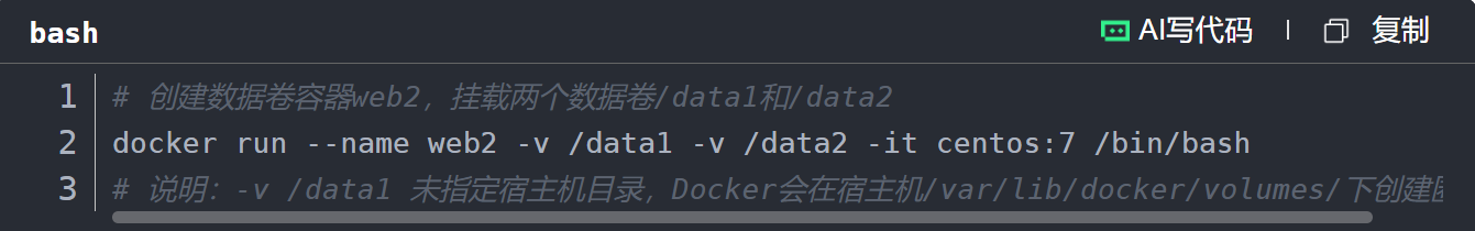 -v /data1 -v /data2: 在容器内部挂载了两个数据卷 /data1 和 /data2。这些数据卷不依赖于宿主机,而是仅仅存在于容器内。