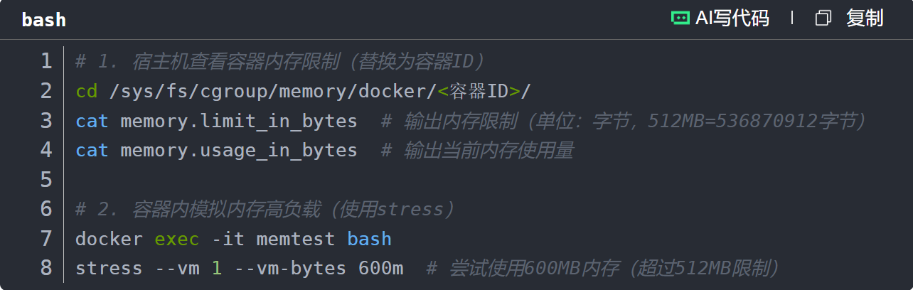 为避免单个容器占用过多宿主机资源(如CPU、内存),Docker基于Linux的cgroups(Control Groups)机制实现资源限制。