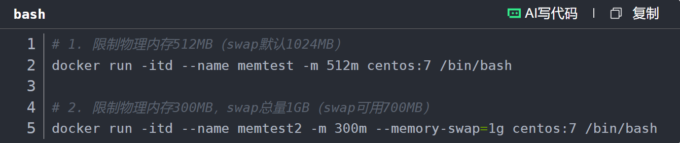 不设置--memory-swap:默认swap为--memory的2倍(如-m 512m,swap默认1024MB);