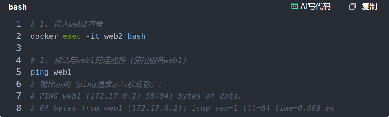 进入web2容器,通过ping命令测试与web1的通信(无需知道web1的Container-IP):