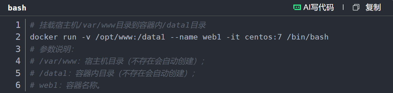 通过docker run的-v或--mount参数挂载数据卷,格式:-v 宿主机目录:容器内目录。