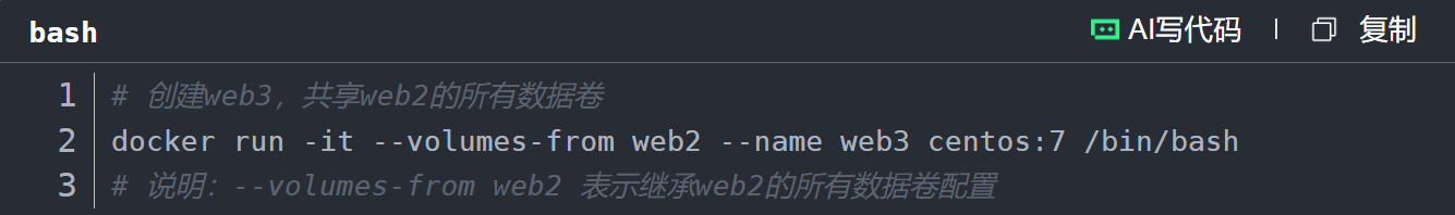--volumes-from web2: 这表示将容器 web2 中的所有数据卷挂载到新容器 web3 中。