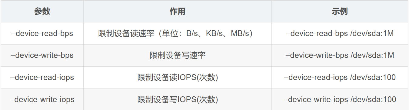 cgroup v2环境中,IO限制参数不同(如使用--device-io-max),需参考对应Docker版本文档。