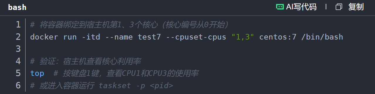 原理:将容器进程绑定到宿主机的指定CPU核心(硬亲和性),避免进程在不同核心间切换,提升性能稳定性。