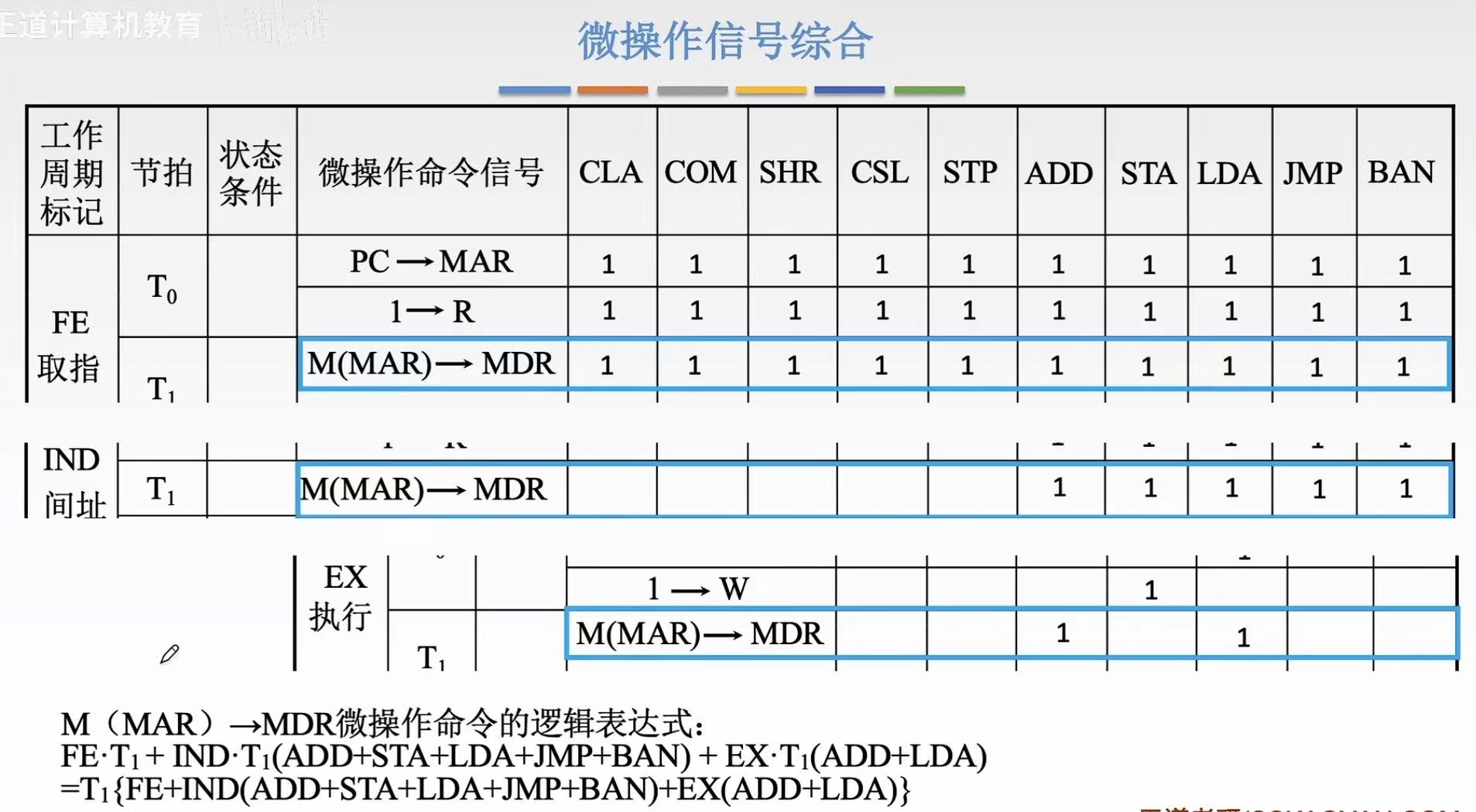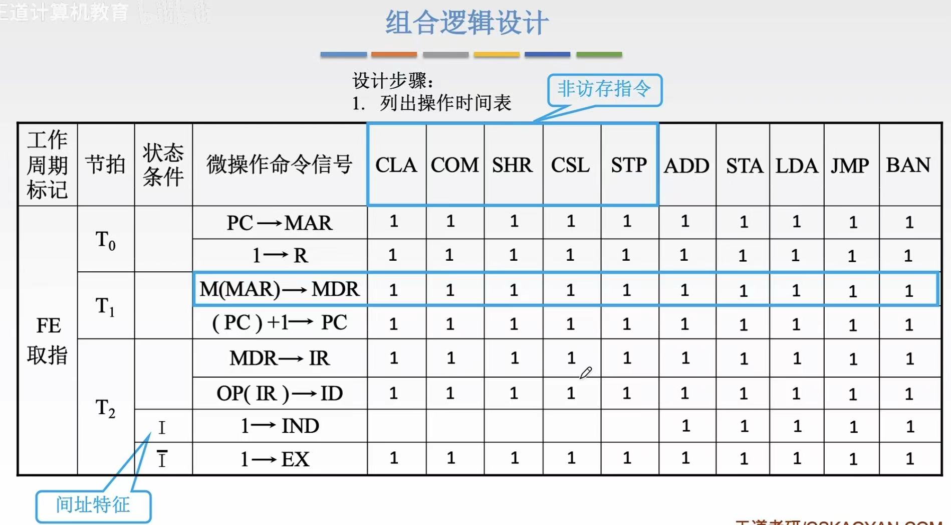 - FE·T1:FE是取指周期,T1是蓝色框住的指令,·表示FE的时候这个指令全部都是1,就是都执行。
