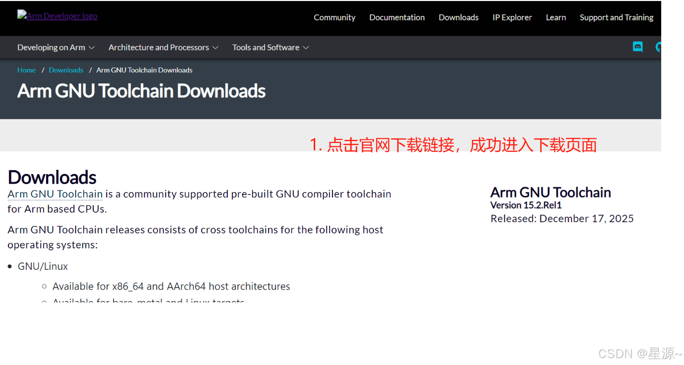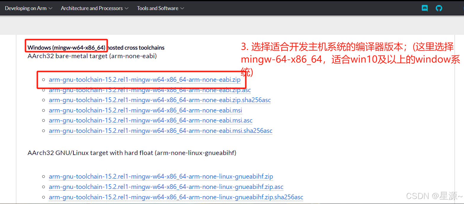 若开发主机是win7等32位系统,则选择工具链 arm-gnu-toolchain-15.2.rel1-mingw-w64-i686-arm-none-eabi