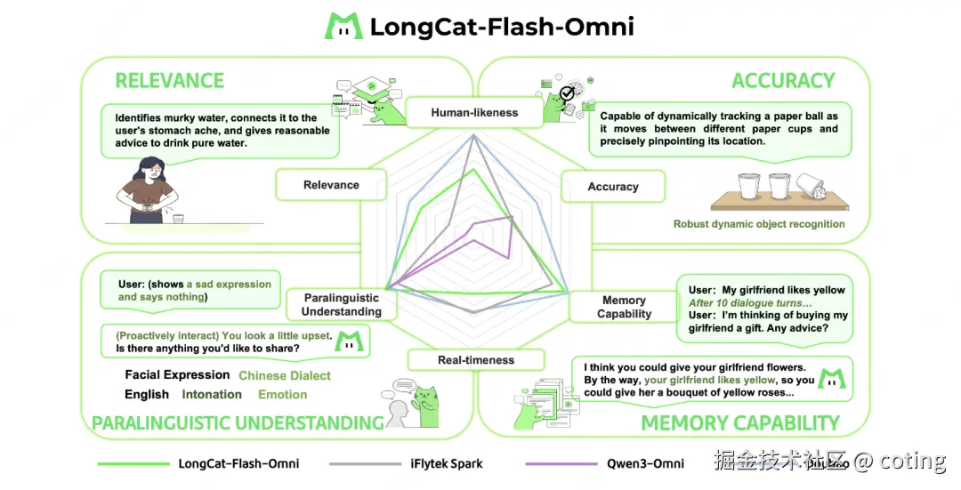 LongCat-Flash-Omni 的出现标志着一个转折点,AI 不再只是语言专家,而是一个能真正"感知世界"的多模态智能体,它能看图、能听声、能理解语气、能生成语音,并在同一框架下完成跨模态推理。