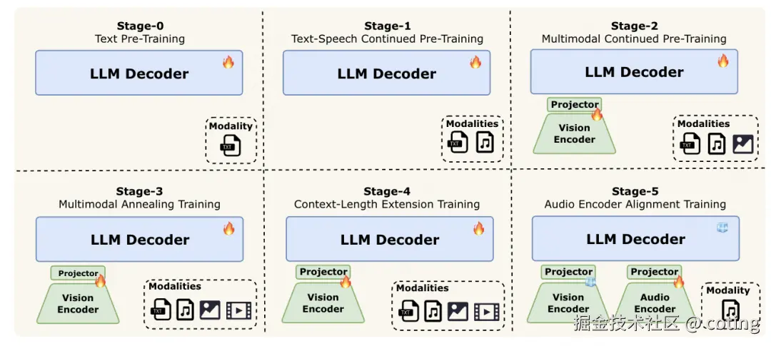 全模态模型的最大难题是------不同模态的数据分布完全不同。Omni 的解决思路是 渐进式早期多模融合训练(Progressive Early Fusion)。