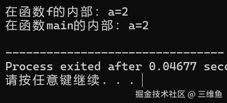 printf("在函数f的内部:a=%d", a);