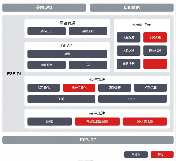 支持自定义模型部署 :对于有特定需求的场景,ESP-DL提供了强大的模型转换与部署能力。库中包含量化工具和转换工具,能够帮助开发者将在TensorFlow、PyTorch等主流框架上训练的浮点模型,转换为可在乐鑫芯片上高效运行的8位或16位定点模型。官方推荐使用TVM等框架来部署自定义模型,并提供了相应的教程指引。