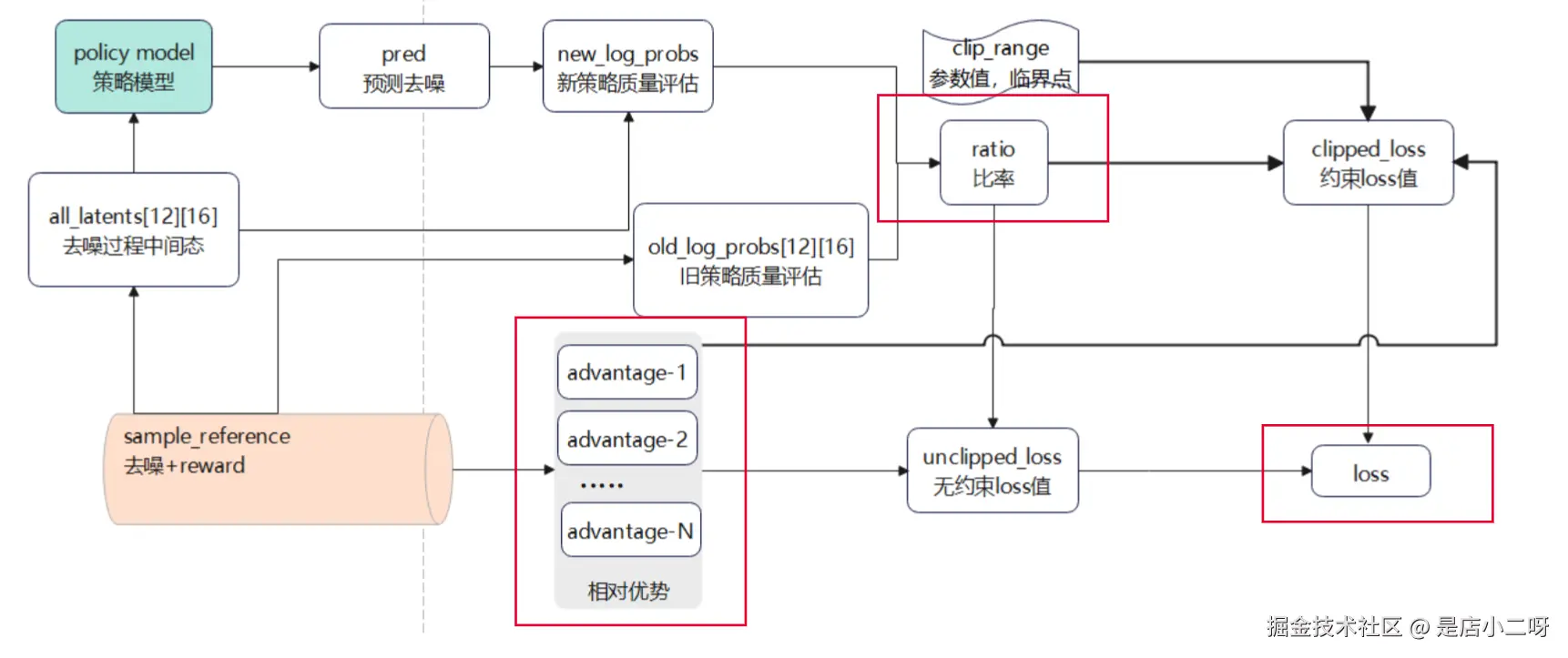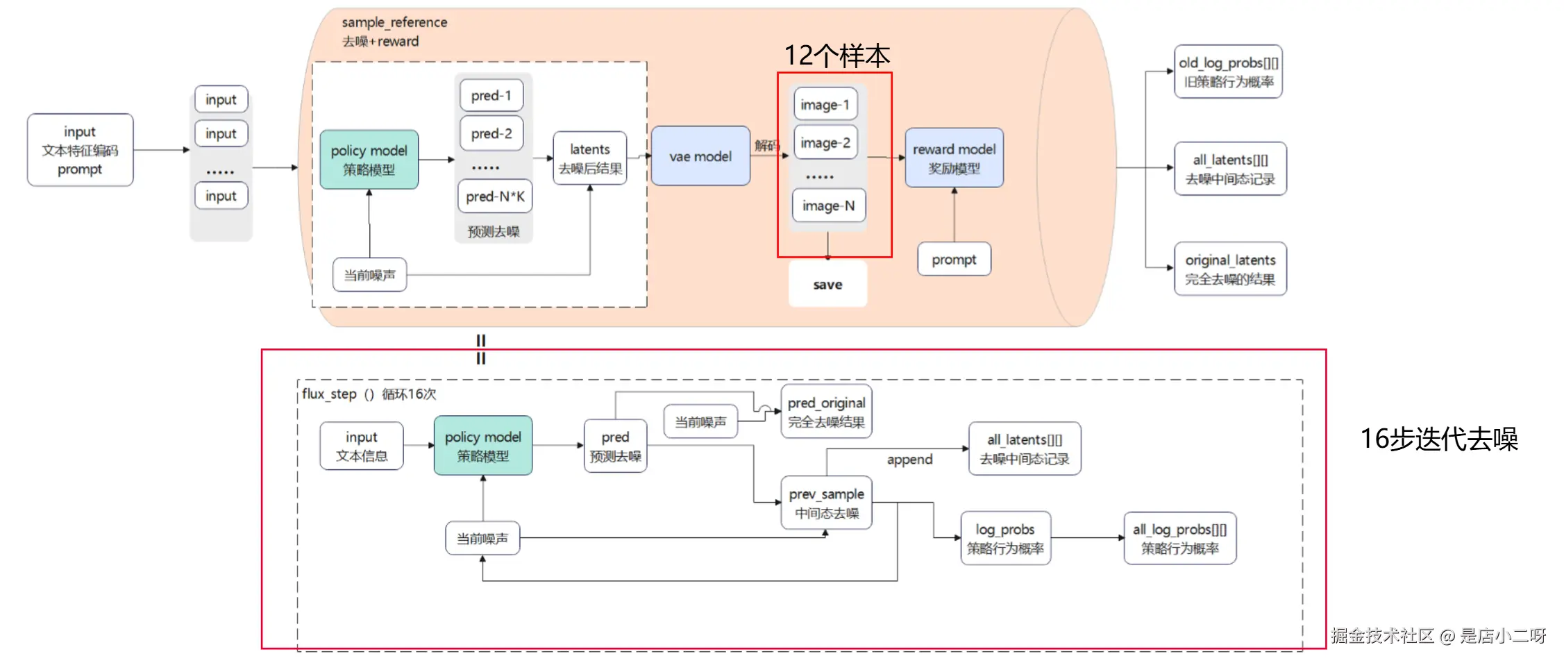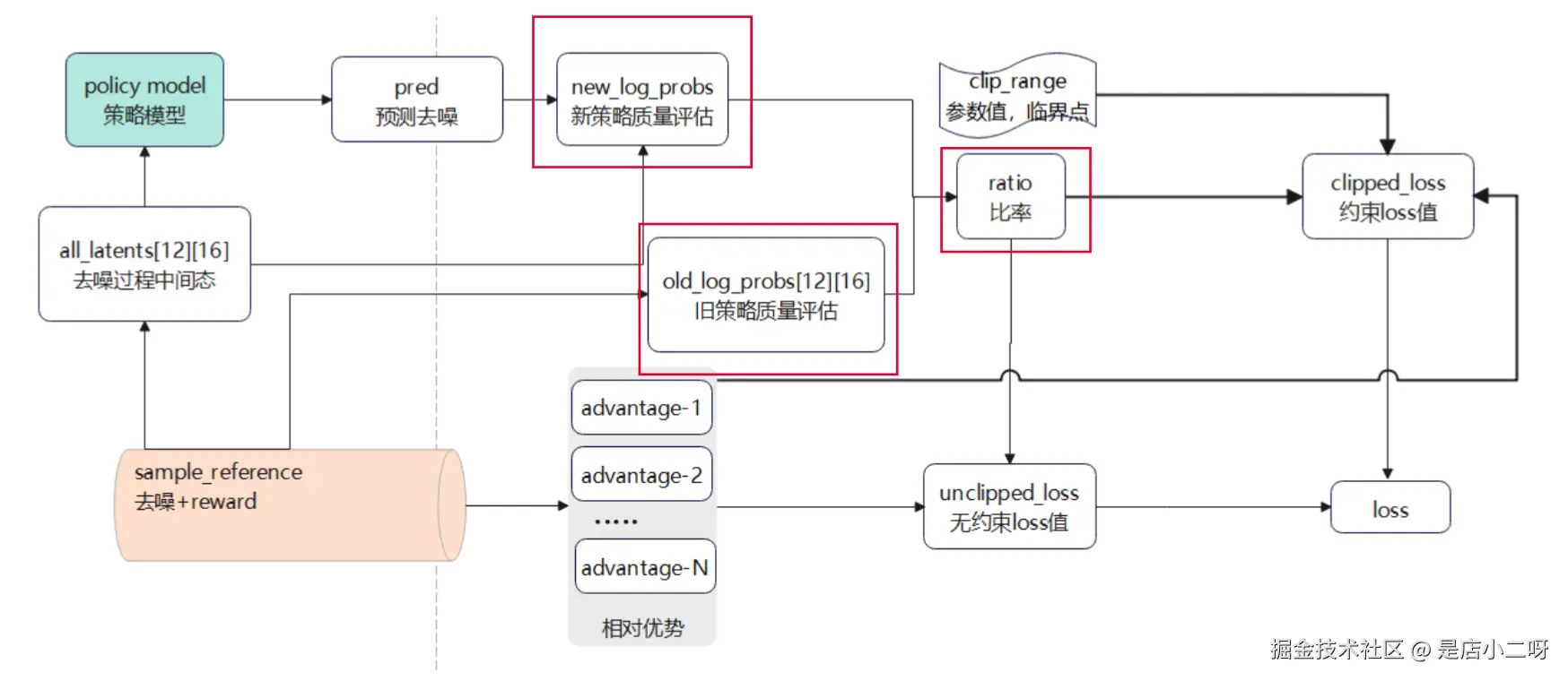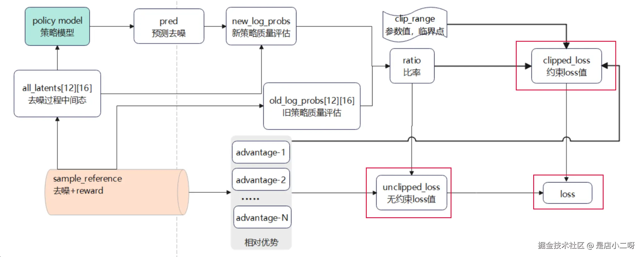 - 记录去噪过程: 前面步骤会记录每个样本的去噪过程状态,包括 reward 值,advantag 值,log_p 值(代表当时策略的对数)。